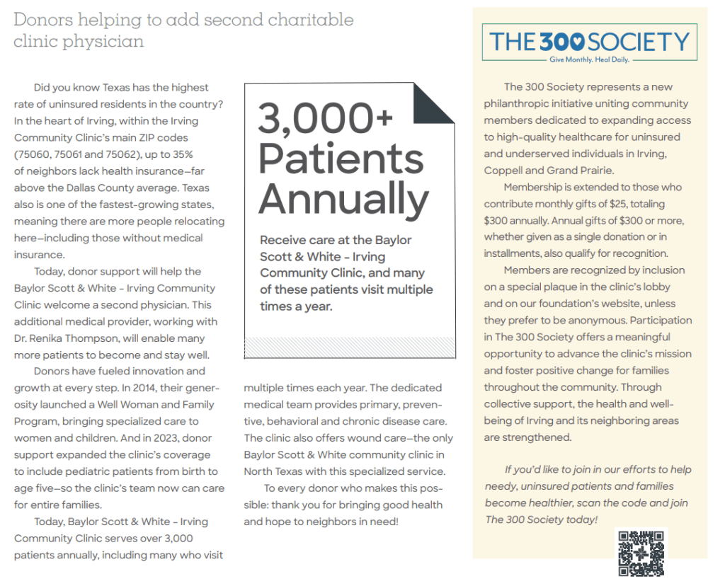 A growing community of individuals who give monthly to the Irving Community Clinic.